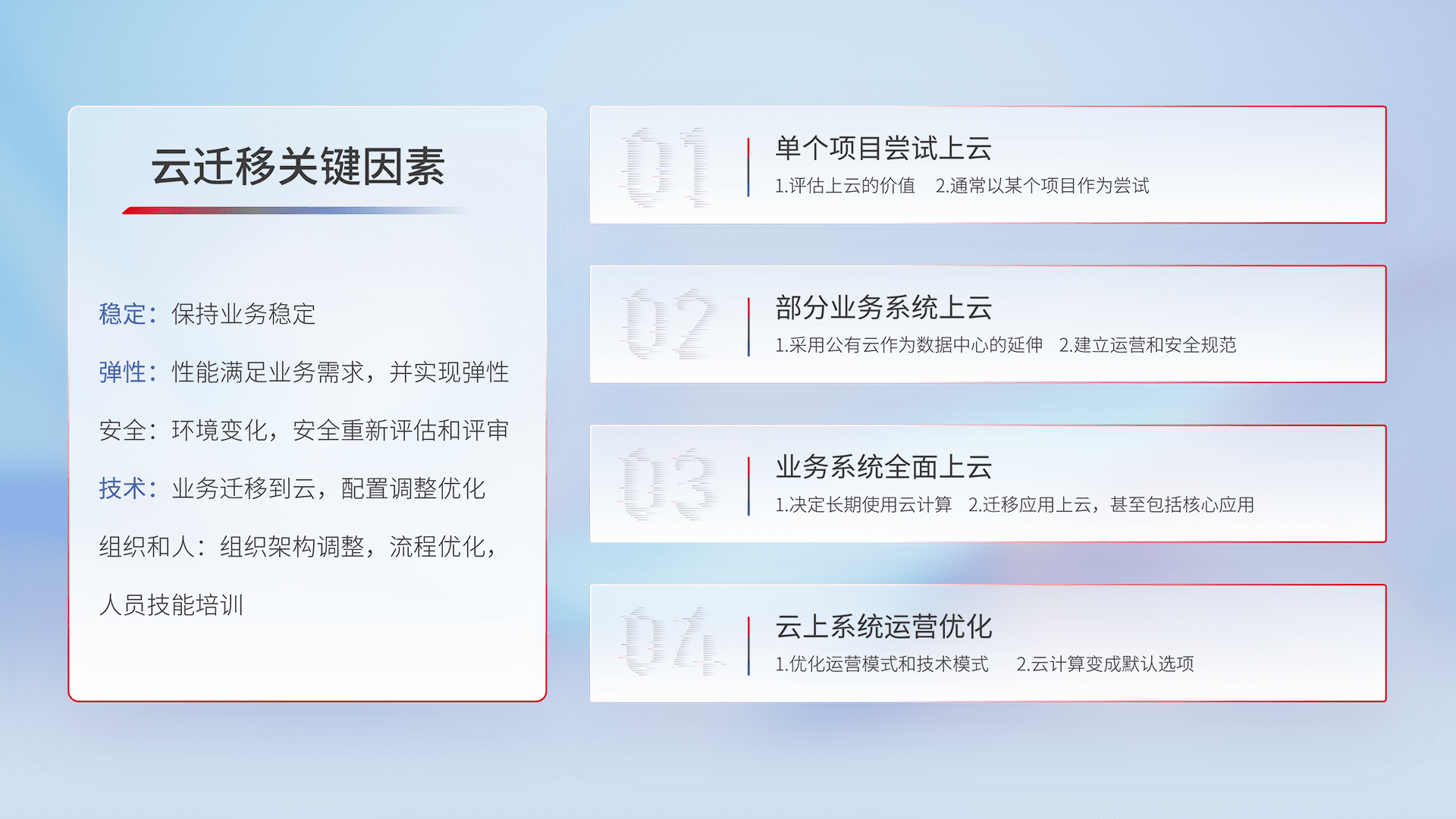 结合实际业务,,,,从规划设计、、、云平台选型、、云原生改造、、、数据迁移、、、、集成交付,,,,迁移全过程为客户识别最佳上云路径,,,,做好风险识别管理,,,,设计网络架构、、、身份权限、、、、安全审计合规、、、操作审计、、、、日志审计、、、监控告警策略、、、、多站点容灾设计等,,对云上基础设施进行整体规划,,,提升IT治理水平,,以满足弹性、、、高可用、、、、高性能的需求。。