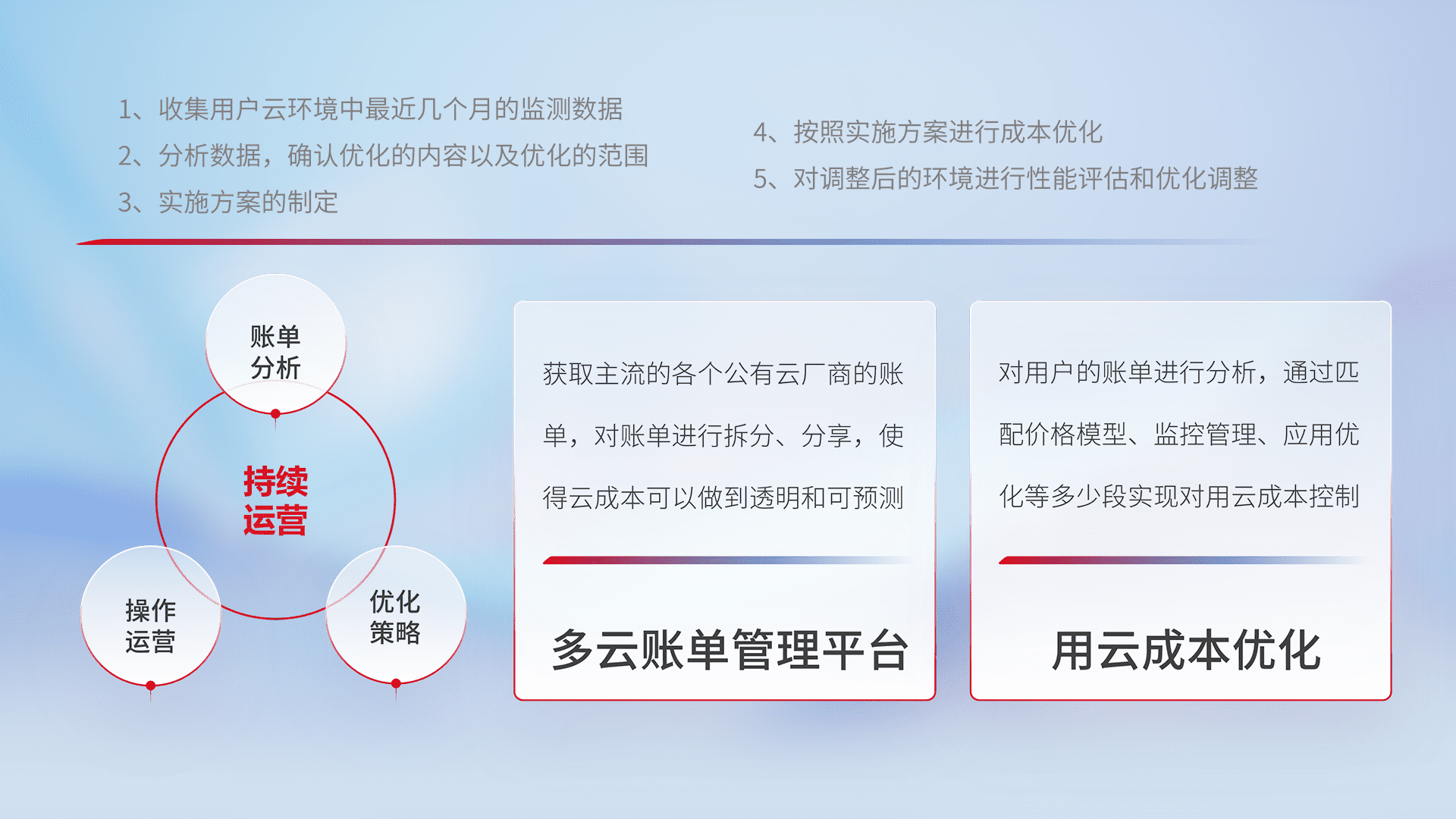 通过多云纳管,,,,以统一的资源数据模型把客户的云资源进行抽象和封装,,进而实现对多云资源的统一操作,,保障云资源管理的可靠性、、、、稳定性与可用性。。。。量身定制化运维内容,,配置、、、、开发运维、、、补丁管理、、、、备份、、、监控、、、、认证和访问管理、、审计和日常巡检等,,,,保障在用云过程中的可靠度,,稳定度以及高可用率。。