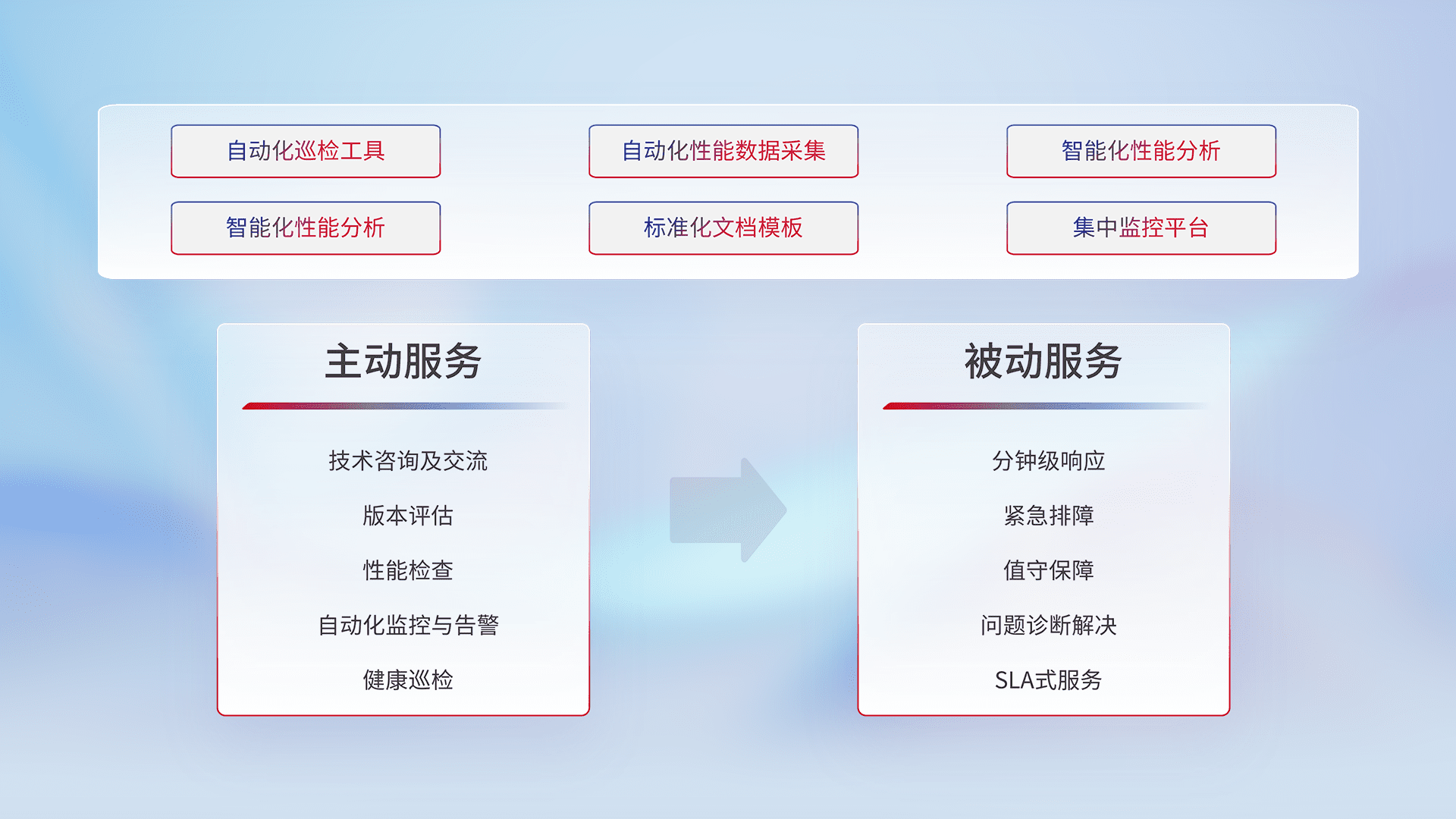 智能化工具和标准化文档,,保障服务质量,,,提供主动服务(包含技术咨询、、版本评估、、性能检查、、、、自动化监控与告警、、健康巡检)和被动服务包含(分钟级响应、、、紧急排障、、值守保障、、问题诊断解决、、、SLA服务)。。。