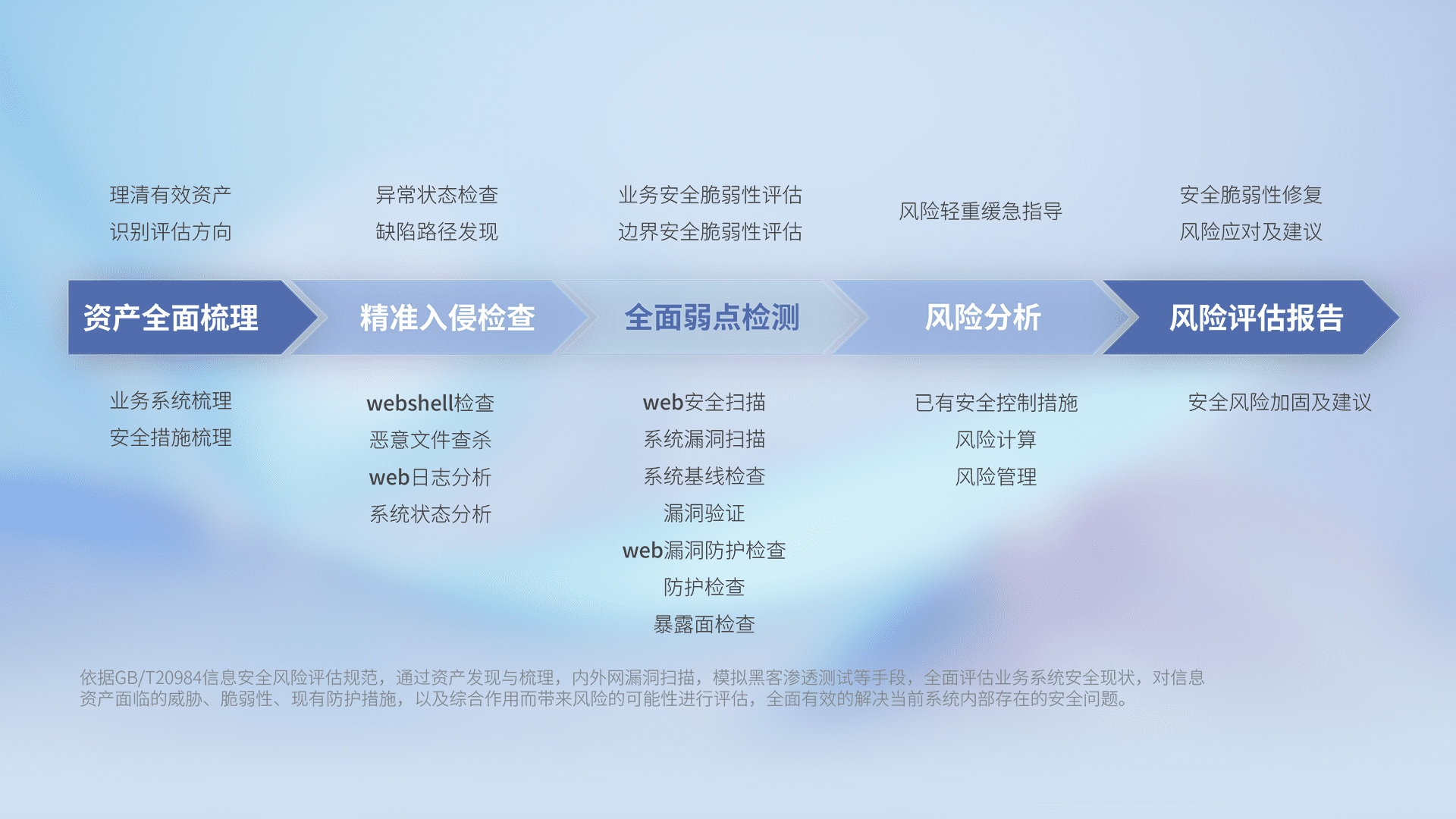 针对客户行业特性,,,,以专业的安全服务+多厂商联合解决方案提供专属的一站式安全管理服务,,,帮助客户全面感知网络空间威胁,,,基于识别、、、检测、、、、分析、、、防护、、、、监测、、响应的服务理论模型,,,,从方案咨询、、集成交付、、、评估验证、、优化加固、、运维运营,,,致力于为客户提供完整的闭环管理式安全服务。。。。以实战经验为客户打造高抵御风险的安全体系,,,,帮助客户发现威胁、、、、对抗威胁、、、、处置威胁,,,,不断积累安全对抗能力,,持续保障数字化安全。。。